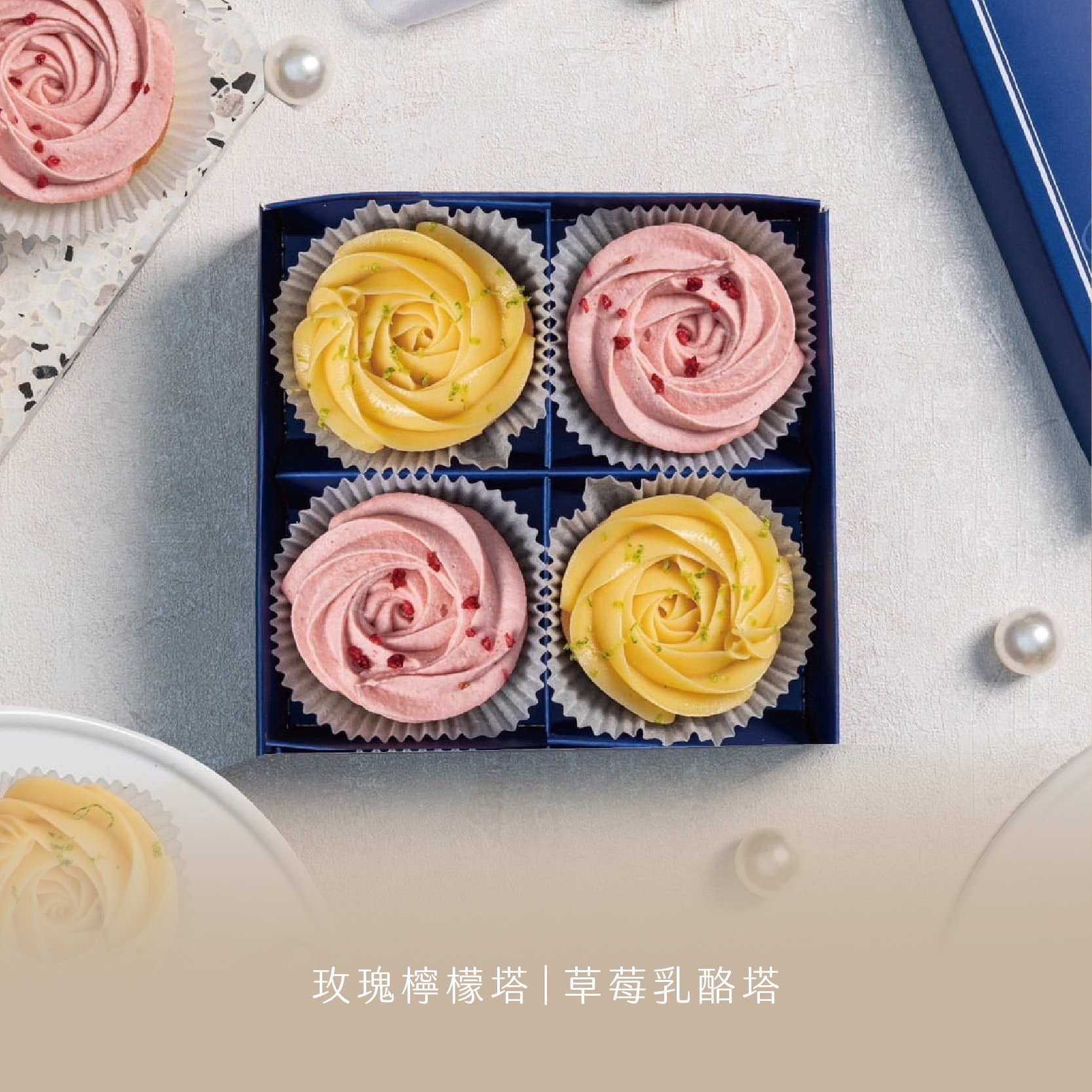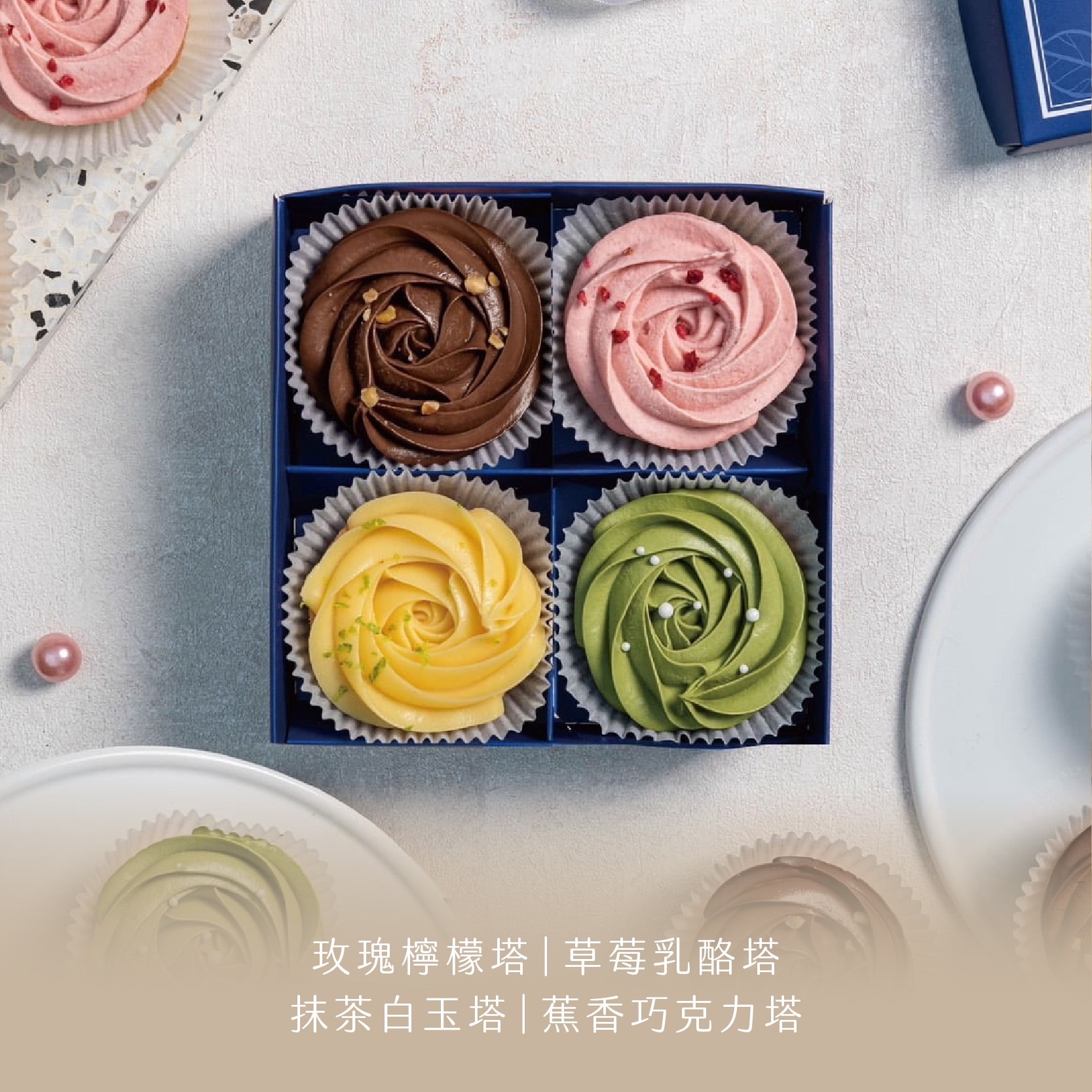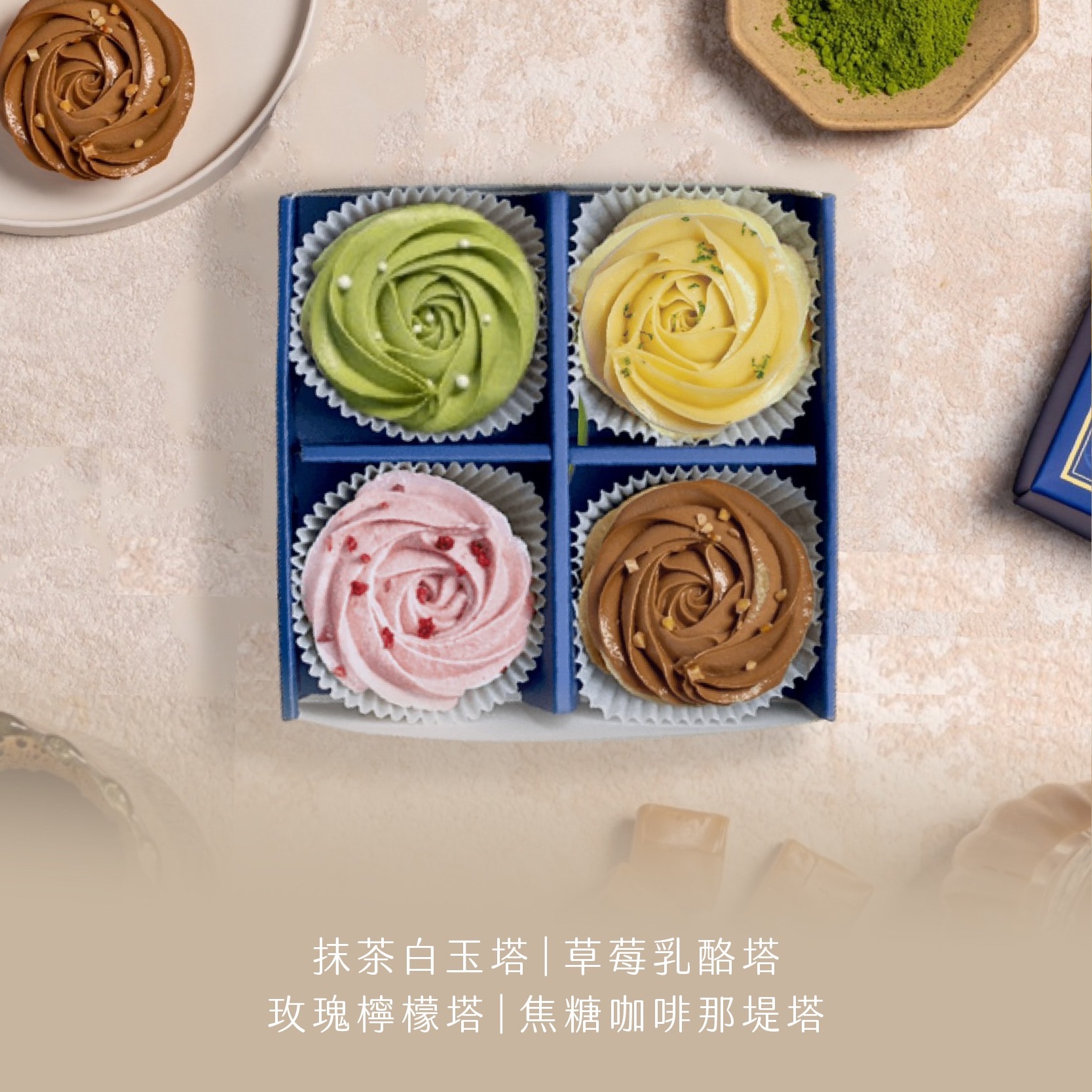 ①抹茶白玉塔/草莓乳酪塔/玫瑰檸檬塔/焦糖咖啡那堤塔